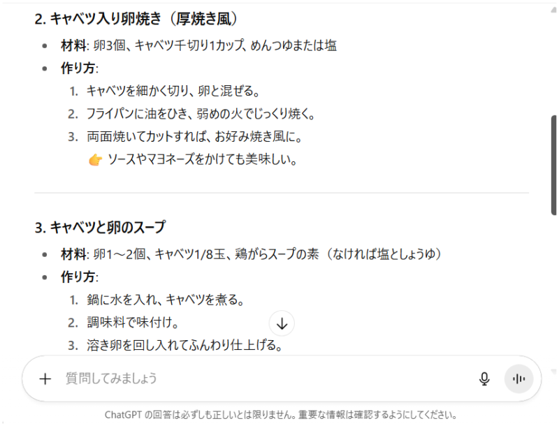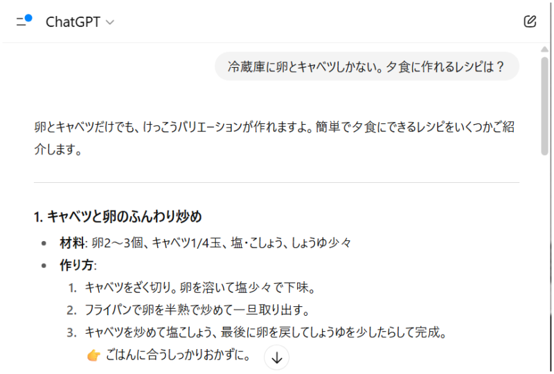 一方ChatGPTなら「キャベツと卵の炒め物」「卵スープ」「オムレツ」など、すぐに作れる料理を提案してくれます。