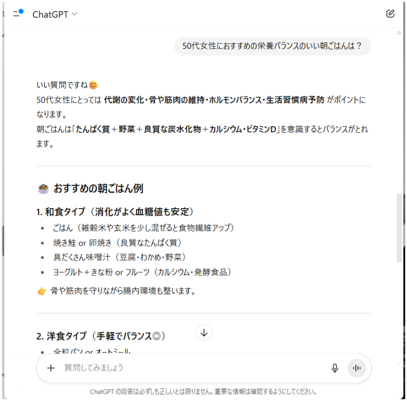 例:「50代女性におすすめの栄養バランスのいい朝ごはんは?」