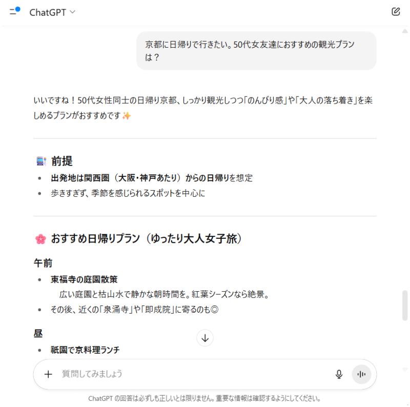 例:「京都に日帰りで行きたい。50代女友達におすすめの観光プランは?」