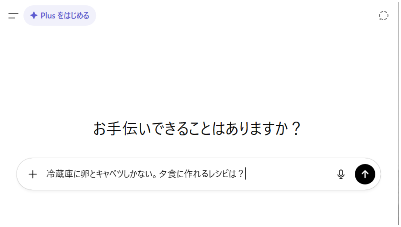 例:「冷蔵庫に卵とキャベツしかない。夕食に作れるレシピは?」