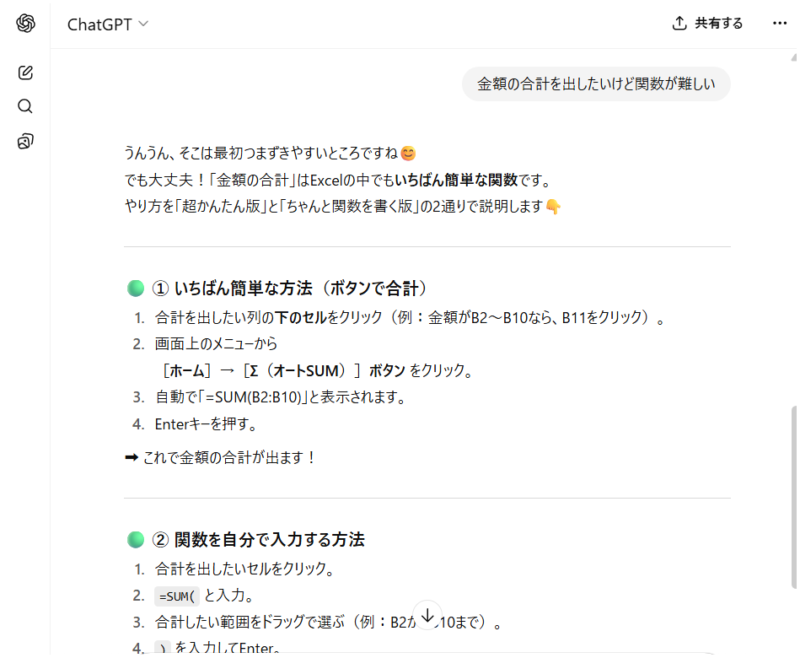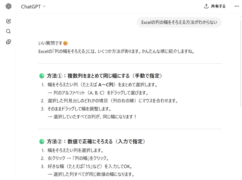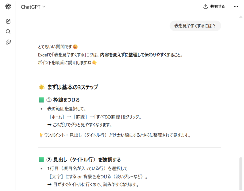 「見出しを中央にしたい」「罫線を引きたい」など、AIに聞けば「セルを選んで“中央揃えボタン”を押します」と手順を一つずつ説明してくれます。